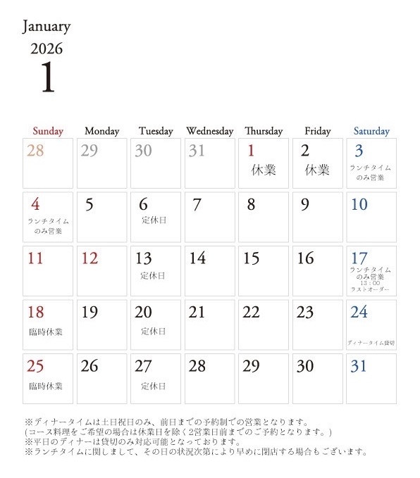 【1月の営業案内】